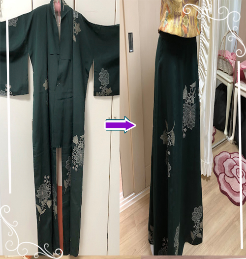 着物からスカートへリメイクしました。柄の繋がりも合わせて作くらせて頂きました。トップスは自由に選べてご着用しやすいリメイクを致しました