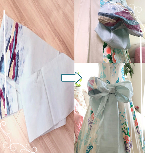 一重帯をお持ちの着物ドレス用の腰リボン飾りへとリメイクを致しました